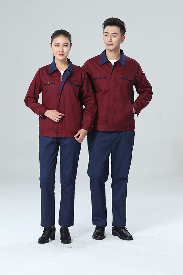 2.機械工人則經常來往于機器之間,需要避免衣服被機器纏絞,還需要耐摩擦。因而,在工作服定制設計時就要求是緊身的,下擺、袖口、褲腿都是可以扣起來的,并且,布料要求較結實、耐磨,色澤以較深為宜。
