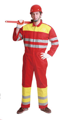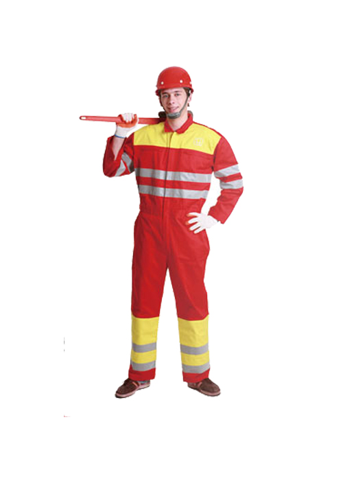 面料:100%純棉,防靜電,防油,防水,20*16,120*60,240GSM;前胸繡花標志,前門襟樹脂拉鏈,兩個帶蓋胸兜和兩個斜插褲兜,后背臀部貼兜,腰部松緊帶,兩條5CM反光條環繞衣前后,雙臂和雙褲腿。