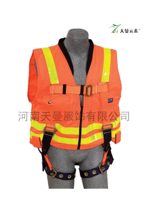 面料:純棉面料,肩上和腰上有反光條,胸前有工字扣,下方有兩條松緊帶。左腰上有一貼兜,兜蓋上有一四合扣。